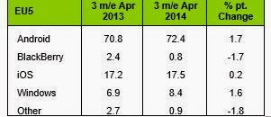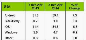 In the US, however, Windows Phone continues to struggle as their market share has dropped to 4.7% from 5.6%. This caused by the fact that Android dominated the early year release with the big boy Galaxy S5 and then HTC one (M8). Also, beside the Lumia Icon, there was no significant Windows Phone released this year. Also, we did not count what will happen when Windows Phone 8.1 handset come. Other OS like Android see an 7.3% increase, while iOS has a 6.8% dropped this year compare to last year.